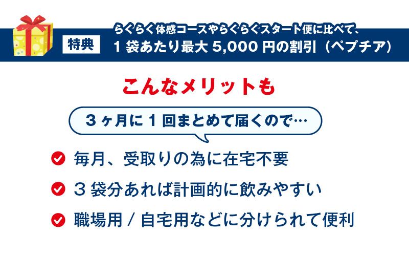 ※長期ご利用で計算した場合に1袋あたり最大5,000円のお値引きできるものとなりますのでご契約いただくコースにはお受取り回数のお約束がございますのでご留意くださいませ。